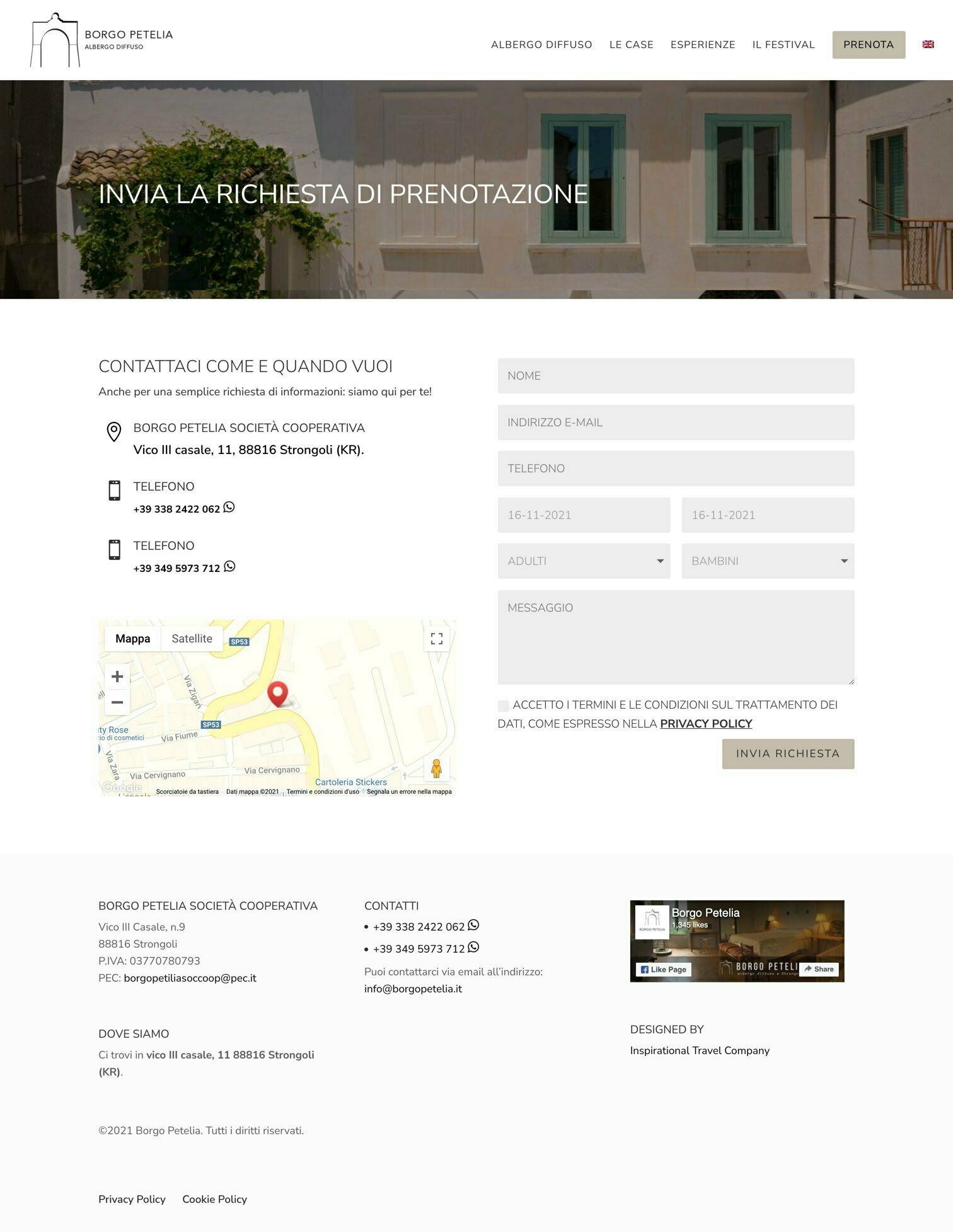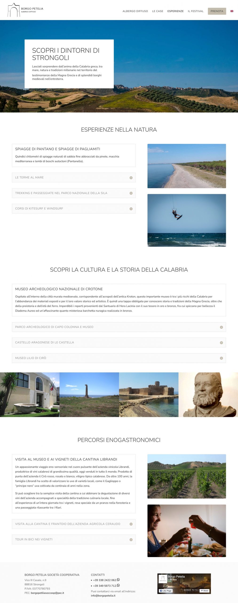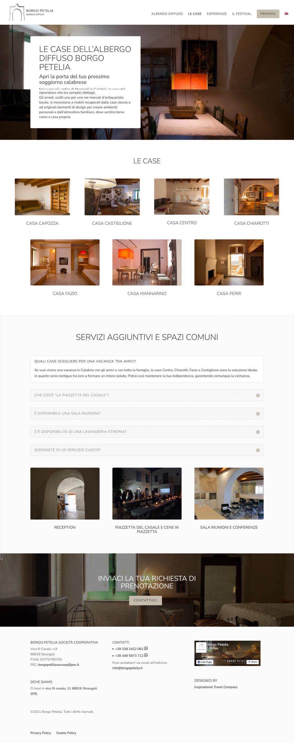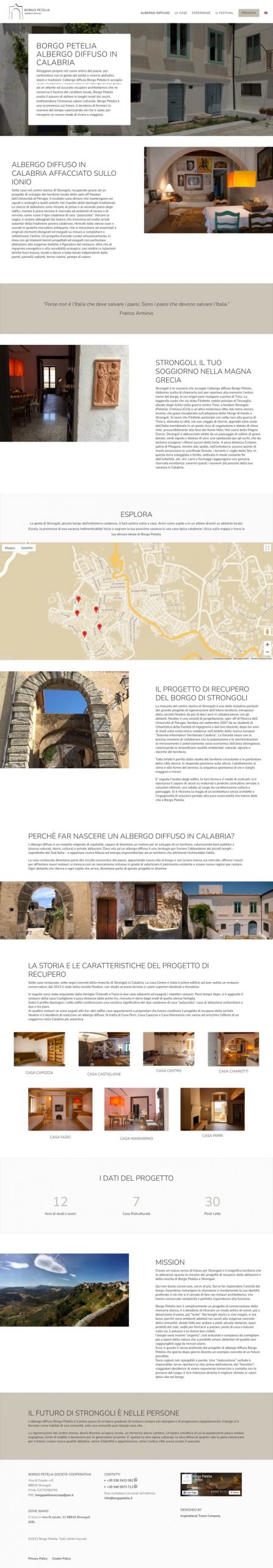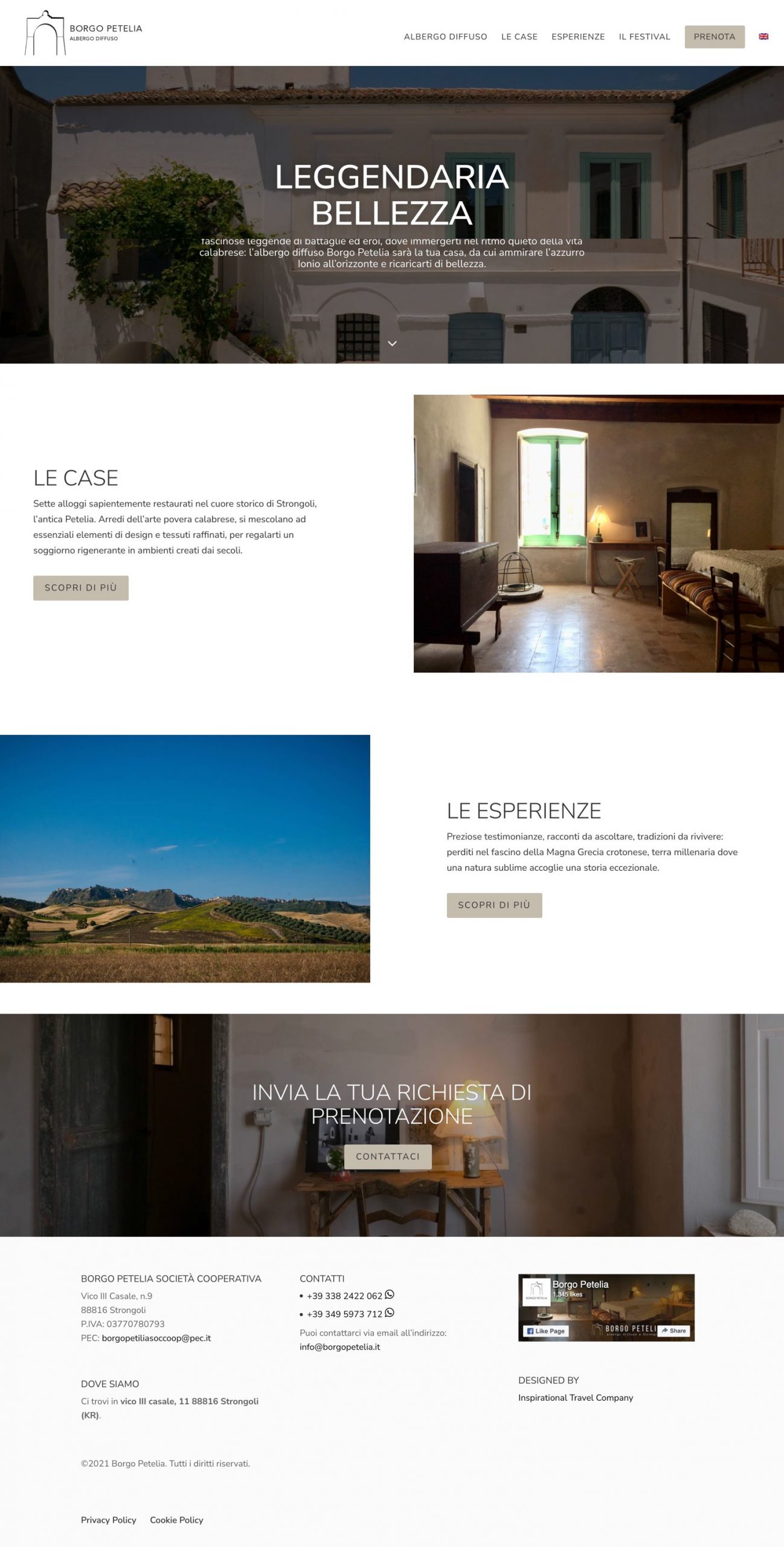 In collaborazione con Inspirational Travel Company, ho realizzato il sito web di Borgo Petelia basato su WordPress e template Divi. Lo stile del sito è stato ideato in modo che già dal sito web, il visitatore possa percepire il silenzio, l’eleganza e la cura dei dettagli che l’associazione Petelia Futura ha posto nella ristrutturazione del borgo e nell’offrire un’accoglienza unica ai visitatori.