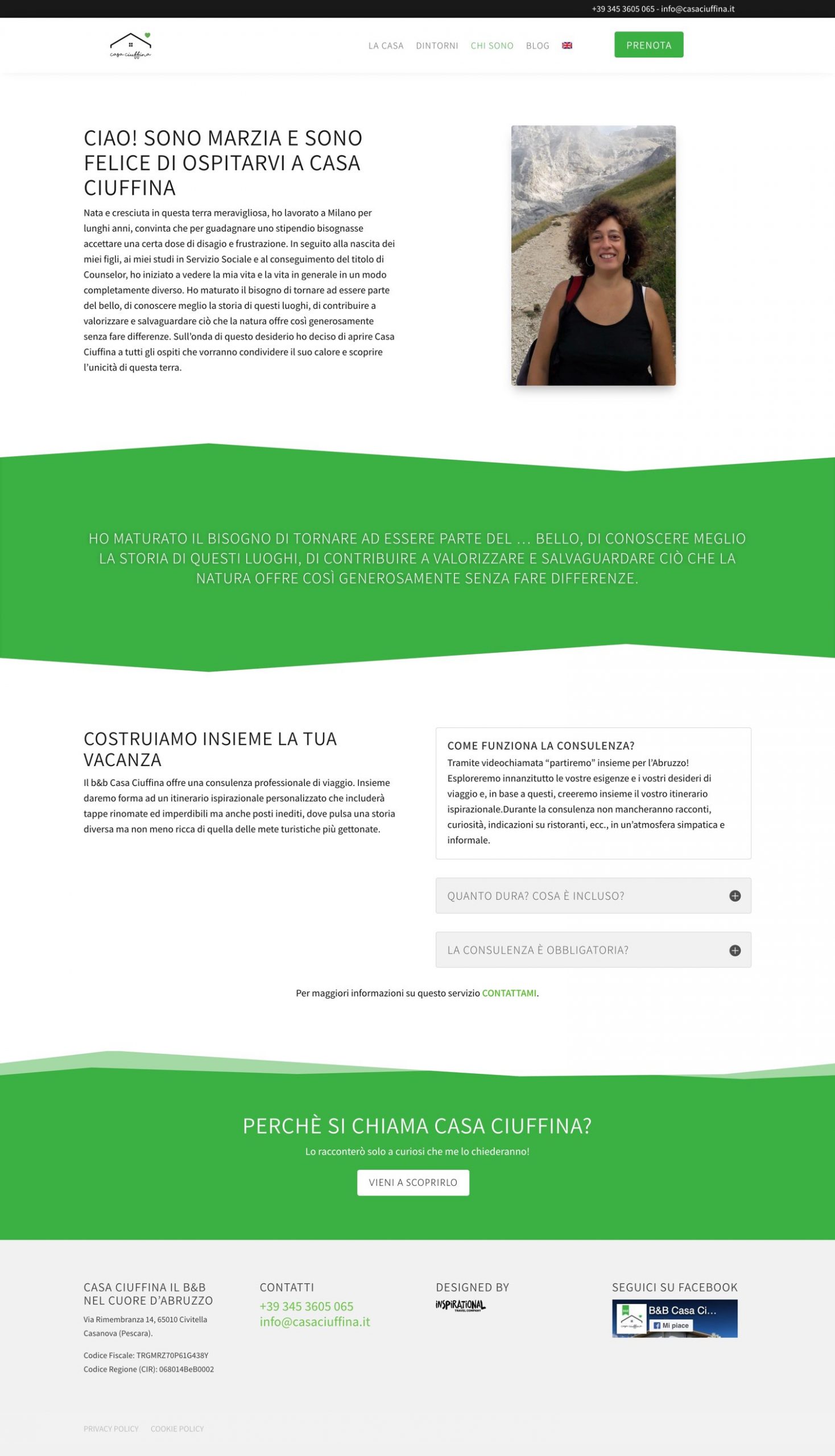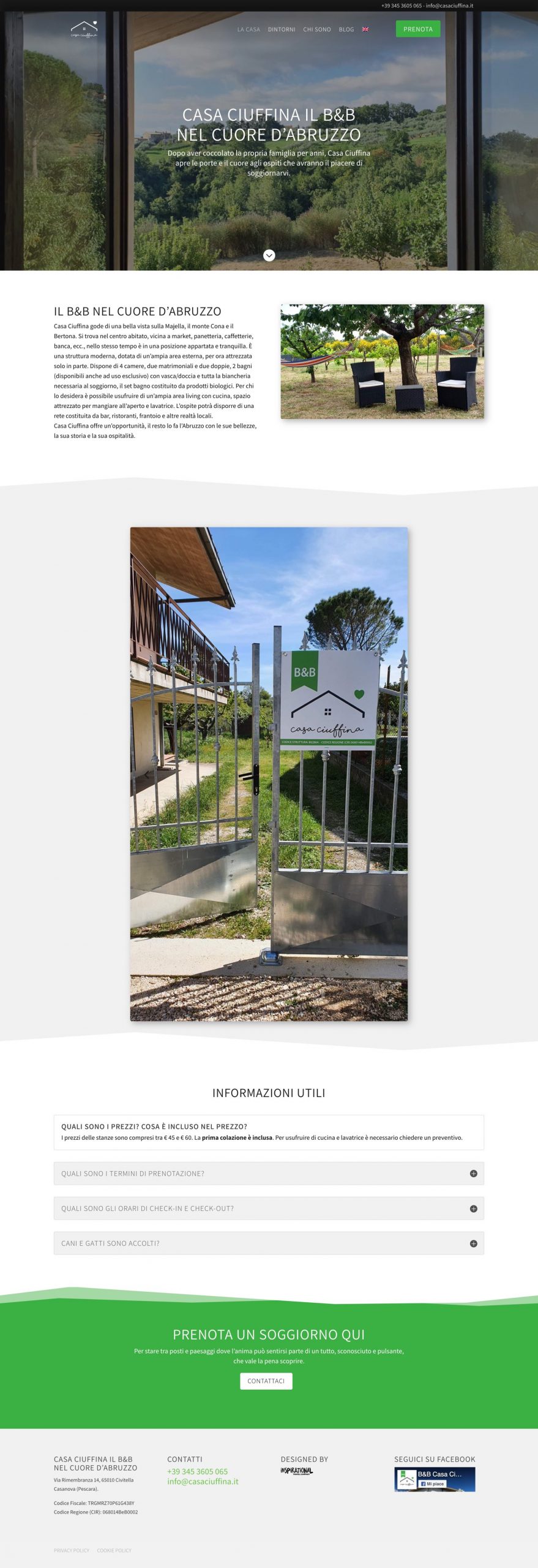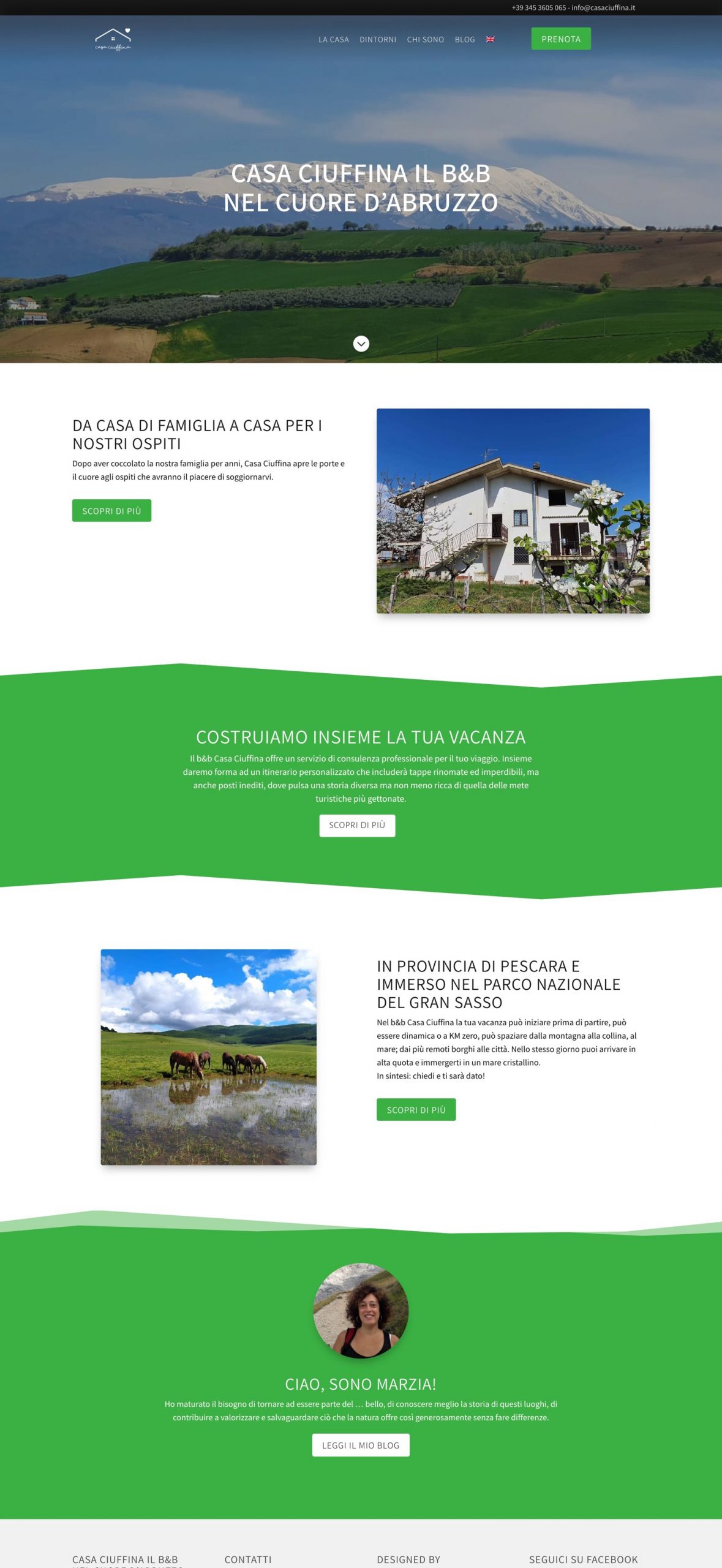 Basato su WordPress e Divi, il sito bilingue è realizzato in stile moderno, semplice e che rispecchi il meraviglioso ambiente naturale nel quale è immersa Casa Ciuffina. La sezione blog darà spazio a Marzia per pubblicare news, pensieri e ricette, mentre la pagina prenota, raccoglie le prenotazioni che arrivano dagli utenti.