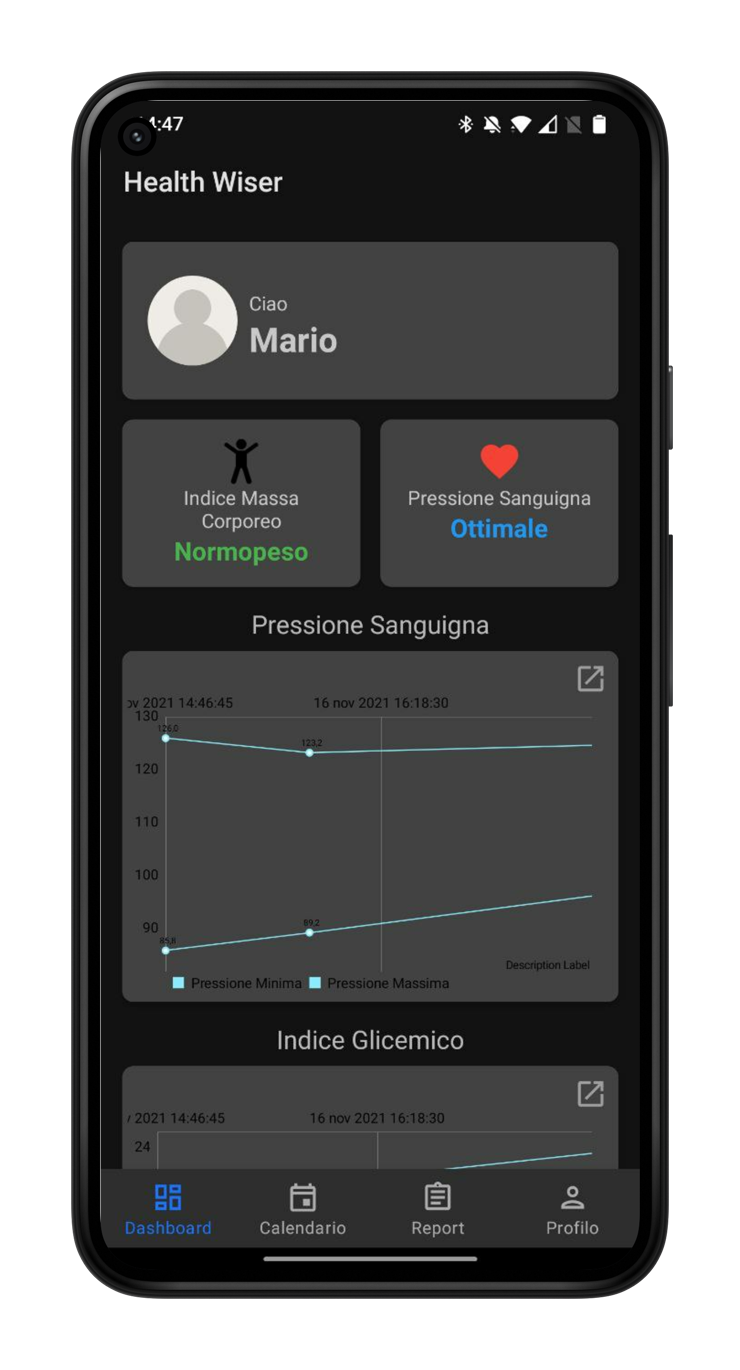 Health Wiser è un personal health monitor che consente all’utente di raccogliere dati sullo stato di salute (pressione sanguigna, peso, glicemia e temperatura corporea) e di mostrarli in grafici personalizzati e di visualizzarne una media giornaliera selezionando un giorno sul calendario.